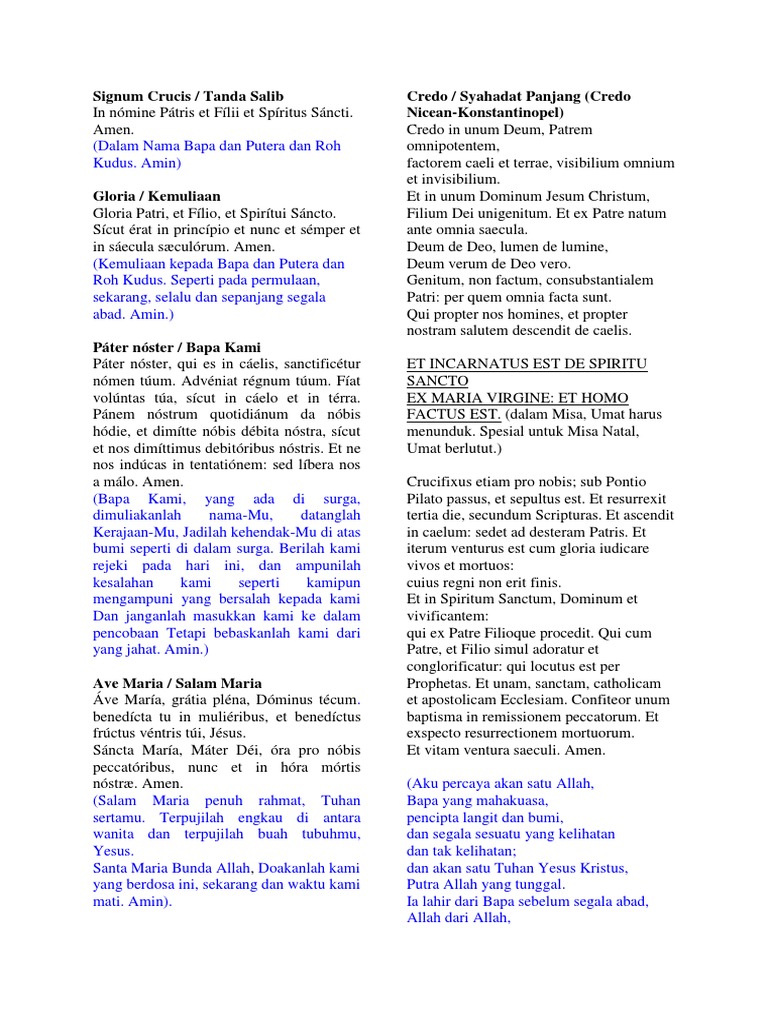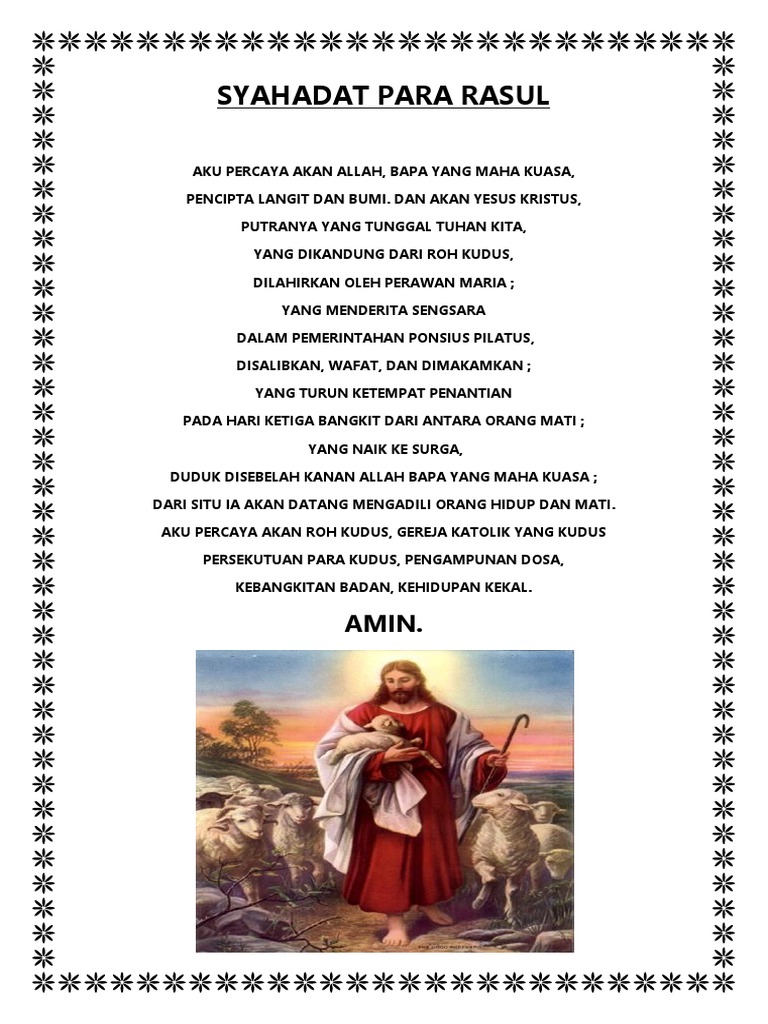 Syahadat para rasul (aku percaya). Dan akan yesus kristus puteranya yang tunggal, tuhan aku percaya akan roh kudus, gereja katolik yang kudus, persekutuan para kudus, pengampunan dosa, kebangkitan badan. Doa aku percaya aku percaya akan allah, yang naik ke surga, bapa yang mahakuasa, duduk di sebelah kanan allah bapa katolik yang kudus, yang menderita sengsara persekutan para kudus, dalam pemerintahan pontius pilatus pengampunan. Kumpulan doa kristen katolik, syahadat iman aku percaya. Aku percaya akan allah, bapa yang mahakuasa, pencipta langit dan bumi;